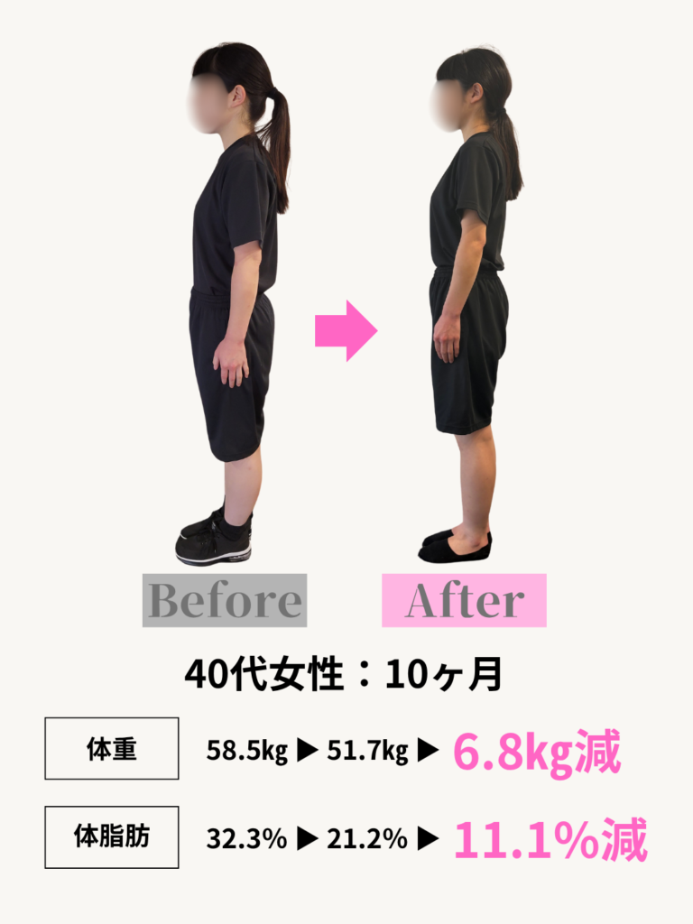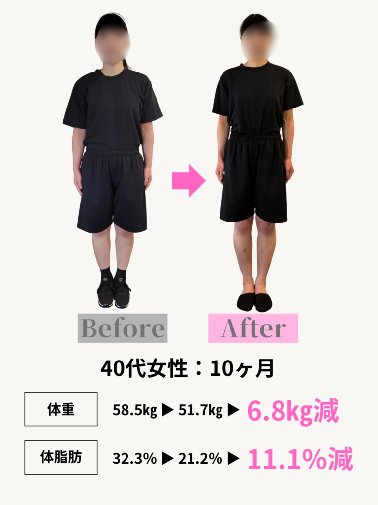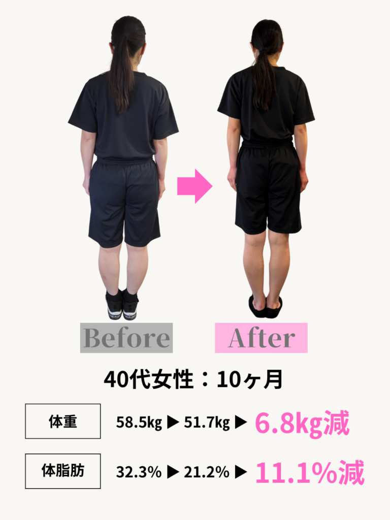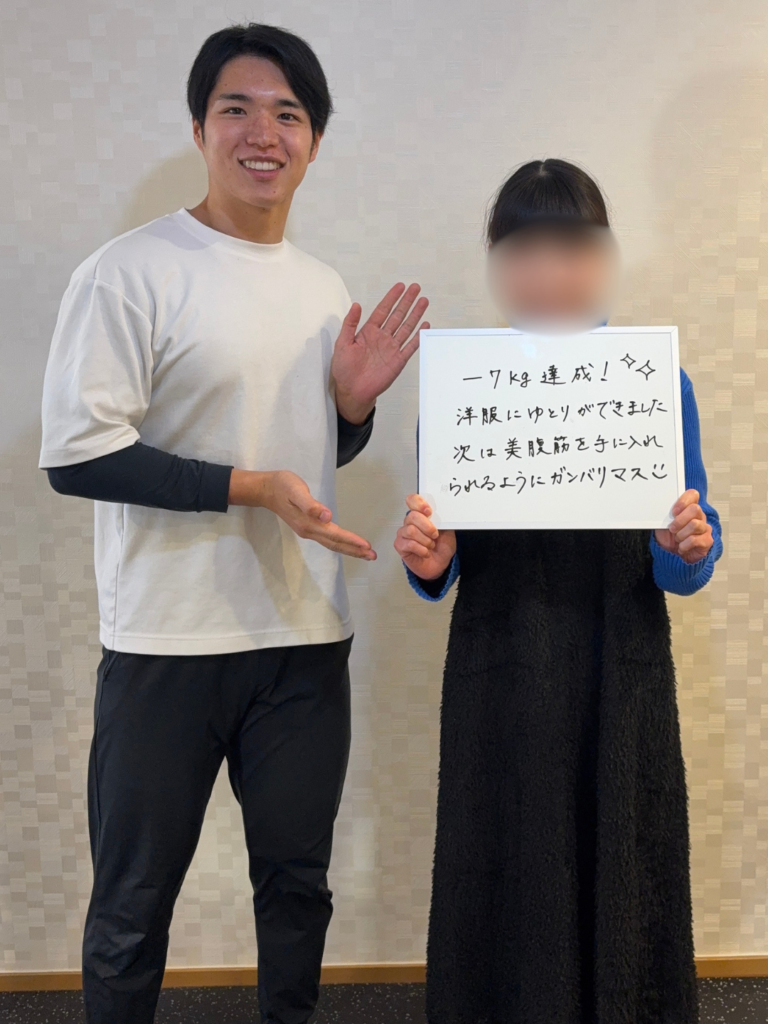 家でのトレーニングをしっかり行っていただいたことでゆっくりではありますが確実にダイエットを進め、一年間で7キロ弱のダイエットに成功しました。